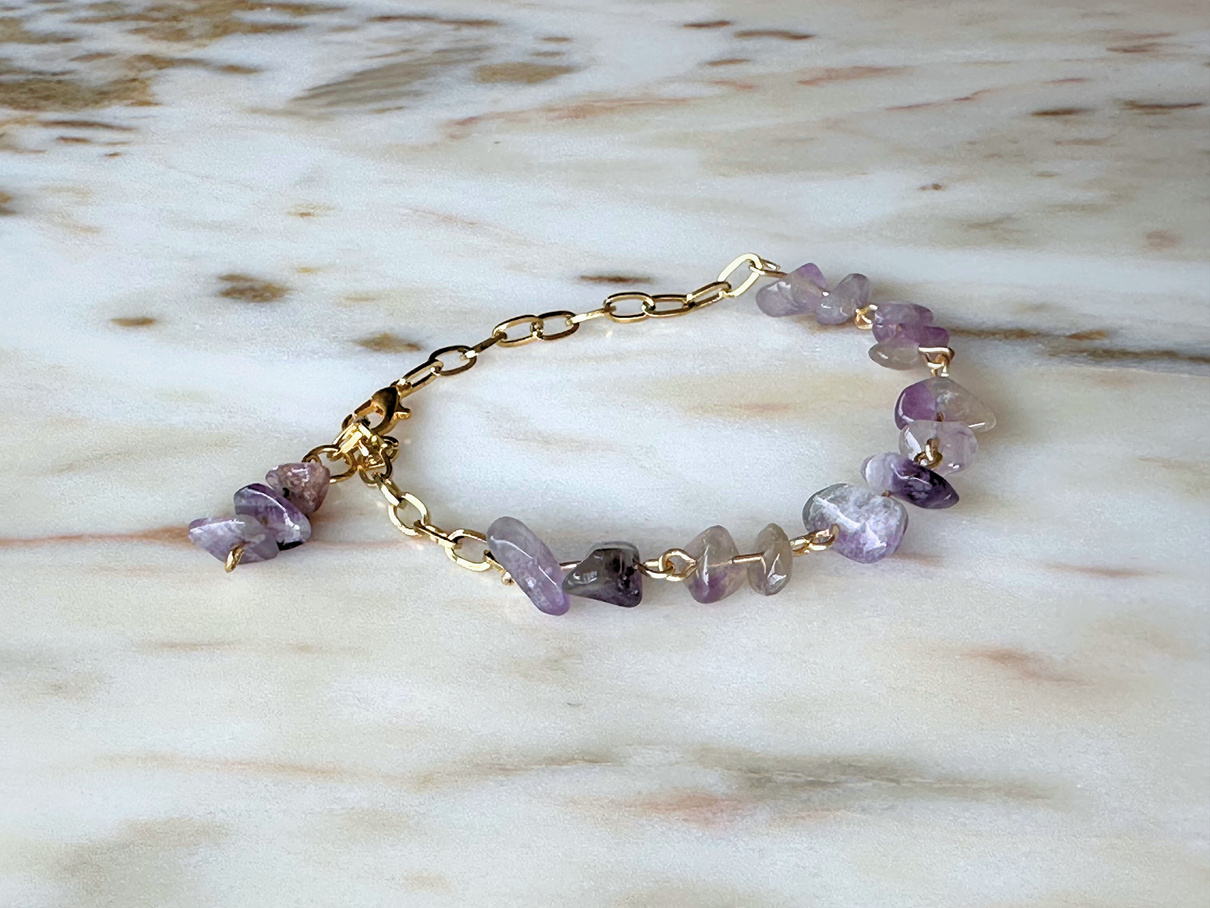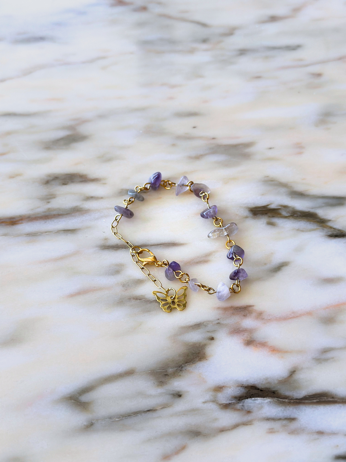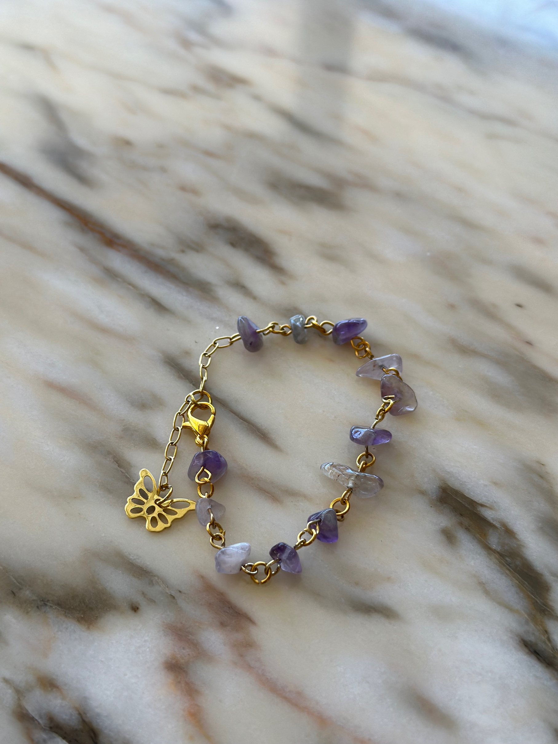 Pulsera de Chips de Amatista con Mariposa en Acero Inoxidable